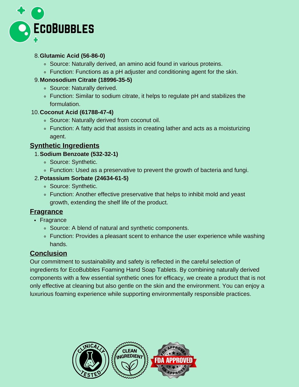 Our foaming hand soap tablets are made with eco-friendly, plant-based ingredients. We prioritize natural components, ensuring that each formulation is free from harmful chemicals: