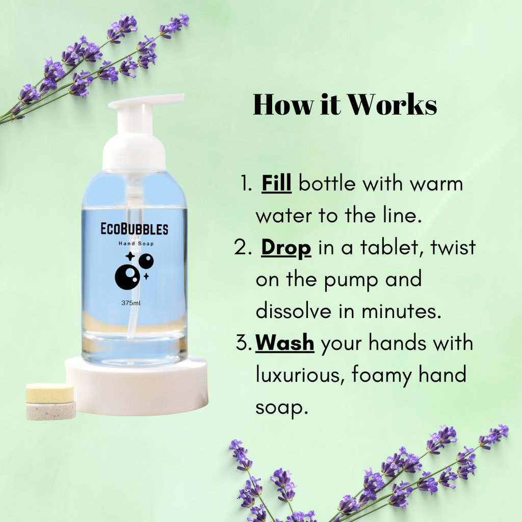 We have eliminated single-use plastic waste from traditional hand soaps by designing a durable bottle meant to be reused indefinitely. Simply add water, insert a tablet, and presto! Enjoy hydrating, foamy goodness at your convenience.